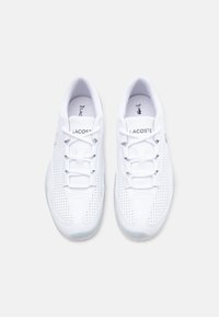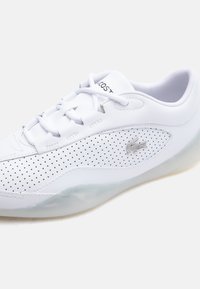 Baskets basses blanches avec côtés perforés, semelle translucide, lacets et logo crocodile noir de Lacoste sur le côté extérieur.