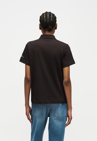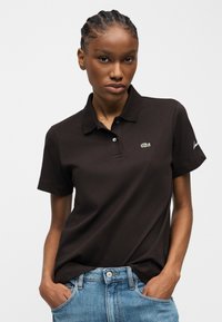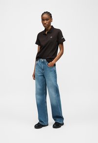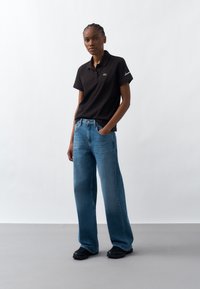 Femme portant un polo noir avec un petit logo vert sur la poitrine et un jean bleu, debout avec une main dans la poche devant un fond uni.