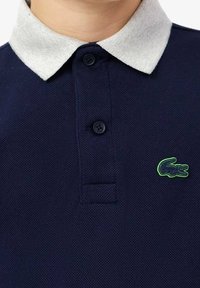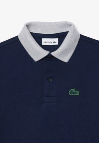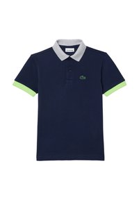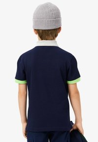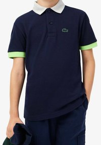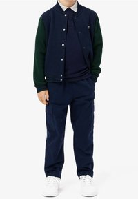 Veste universitaire bleu marine et verte avec boutons pression, portée sur un polo bleu marine, associée à un pantalon cargo bleu marine et des baskets blanches.