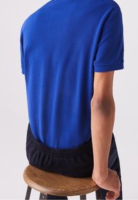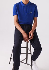 Chemise polo bleue en coton avec col et manches courtes, associée à un pantalon plissé noir et des baskets blanches.