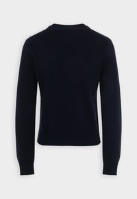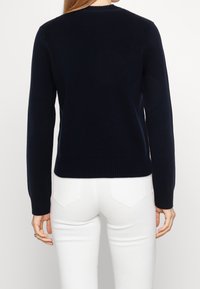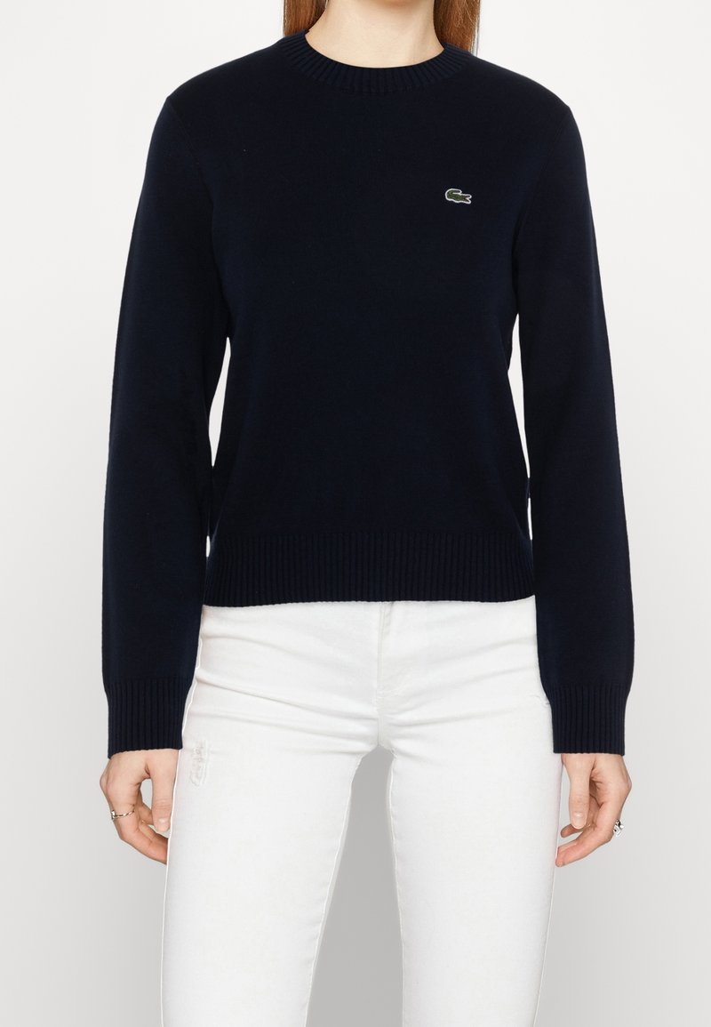 Femme portant un pull à manches longues bleu marine avec un petit logo crocodile et un pantalon blanc ajusté sur un fond uni.
