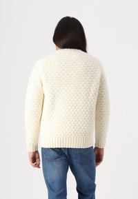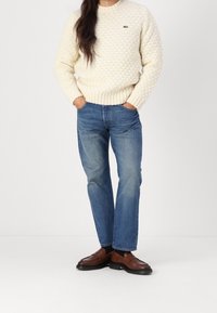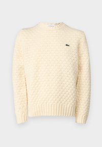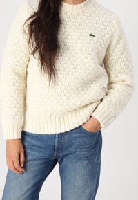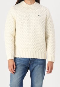 Homme portant un pull en maille texturée crème avec un petit logo de crocodile vert sur la poitrine et un jean bleu.