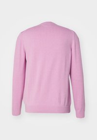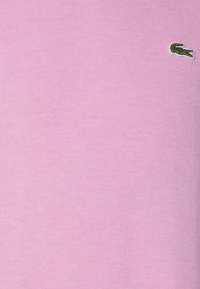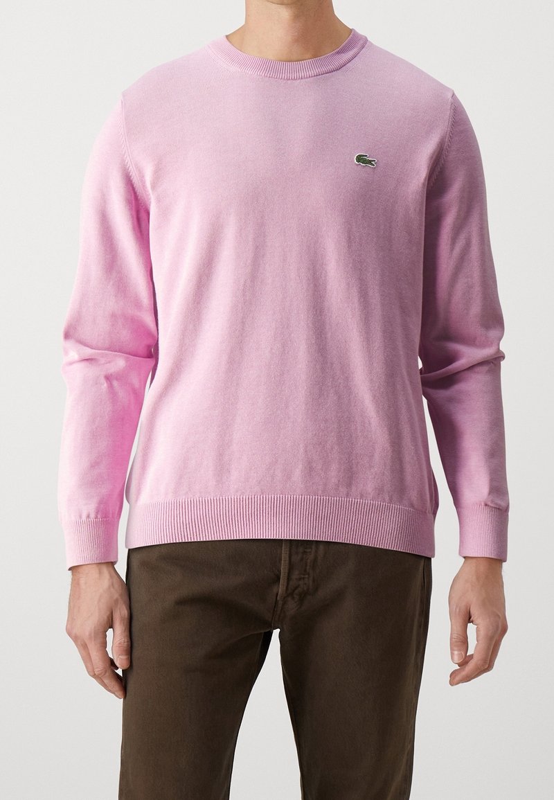 Homme portant un pull ras du cou rose clair avec un petit logo de crocodile vert sur la poitrine et un pantalon marron foncé.