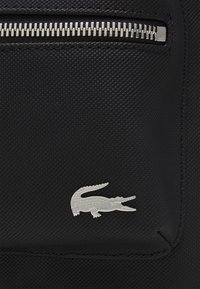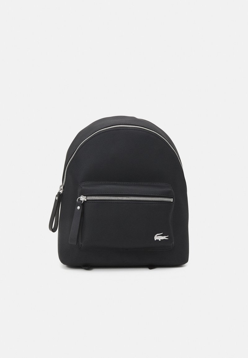 Sac à dos en tissu noir de forme arrondie, doté d'une poche zippée à l'avant et de ferrures argentées. Orné d'un logo Lacoste.