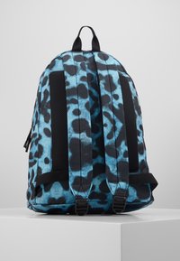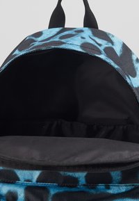 Sac à dos bleu et noir à imprimé léopard avec une poche avant zippée, en tissu, et une poignée de transport supérieure. Logo Lacoste sur la partie inférieure avant.