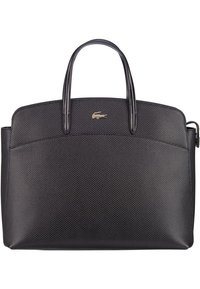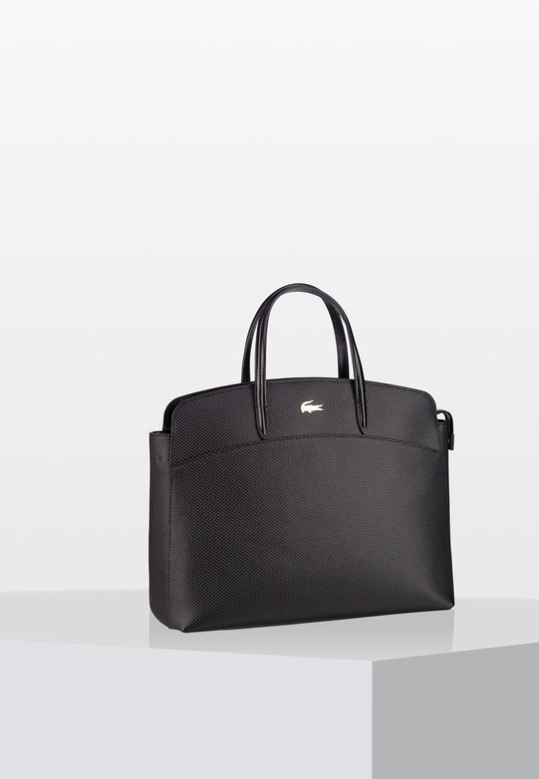 Sac fourre-tout texturé noir avec deux poignées et un petit logo crocodile blanc en haut au centre, posé sur une surface blanche.