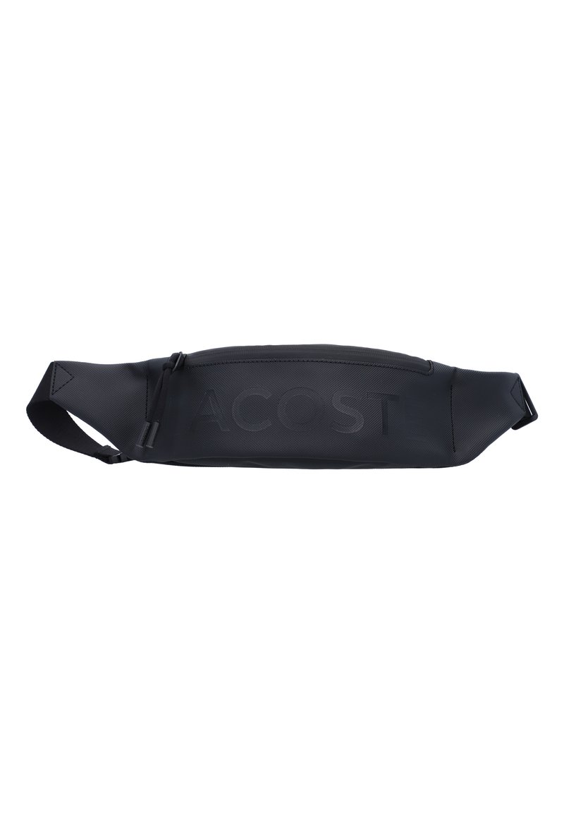 Banane noire profilée avec une fermeture éclair et un logo "LACOSTE" en relief subtil sur le devant.