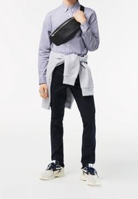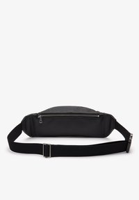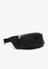 Banane noire texturée avec fermeture éclair argentée et logo crocodile embossé, exposée sur un piédestal blanc sur fond uni.