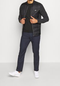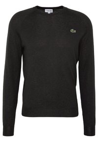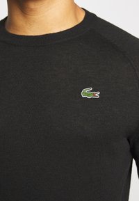 Homme portant un pull noir uni à manches longues avec un petit logo crocodile vert sur la poitrine et un pantalon bleu foncé.