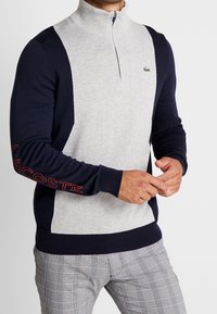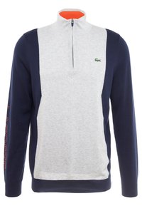 Homme portant un pull à demi-fermeture éclair bicolore gris et marine avec l'inscription "Lacoste" sur la manche et un petit logo crocodile sur la poitrine.