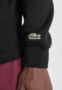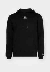 Sweat à capuche noir Lacoste avec poche kangourou à l'avant, capuche à cordon de serrage, texte logo blanc "Lacoste Paris" et emblème crocodile sur la poitrine et la manche.