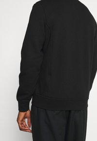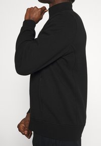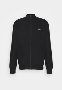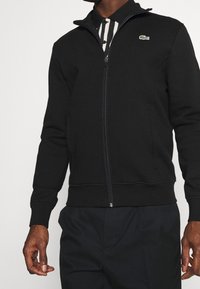 Homme portant une veste noire zippée avec le logo Lacoste, un pantalon noir et une chemise à col rayée noire et blanche en dessous.