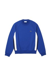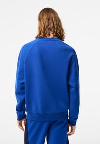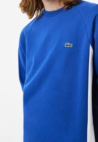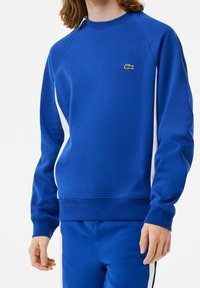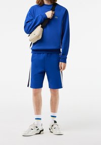 Homme portant un sweat-shirt bleu et un pantalon bleu assorti avec des bandes blanches sur les côtés, arborant un petit logo de crocodile vert sur la poitrine.