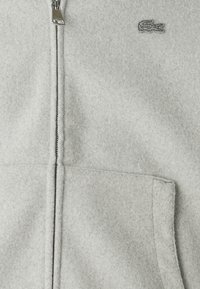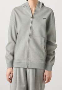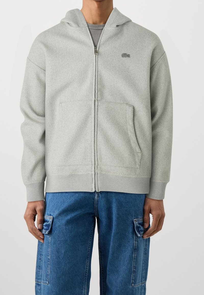 Personne portant un sweat à capuche Lacoste gris clair avec logo sur la poitrine et la manche, assorti à un pantalon vert olive, main dans la poche sur fond blanc.