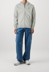 Homme portant un sweat à capuche gris clair zippé avec une poche kangourou et un pantalon cargo en denim bleu sur un fond uni.