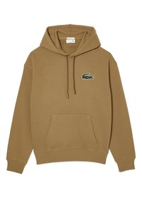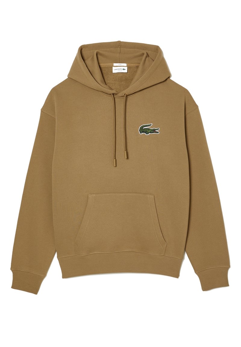 Sweat à capuche marron avec poche kangourou à l'avant et logo crocodile vert sur le côté gauche de la poitrine.