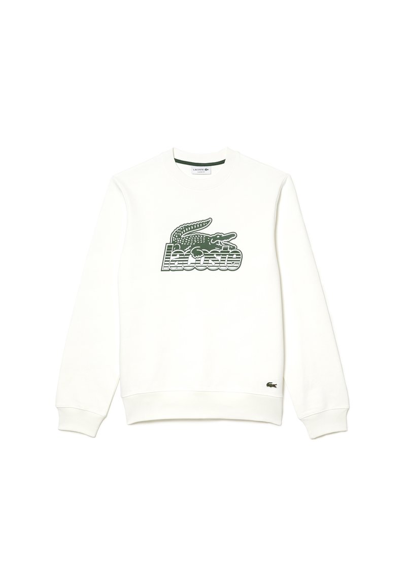 Sweat-shirt blanc à manches longues avec logo Lacoste rayé vert et graphisme de crocodile centrés sur la poitrine, poignets et ourlet côtelés.