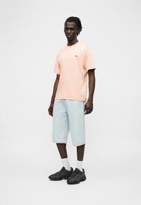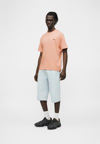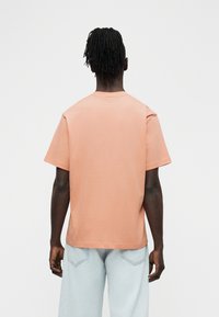 Homme à la peau foncée et cheveux tressés portant un t-shirt à manches courtes pêche avec un petit logo et un jean bleu clair, debout devant un fond blanc.
