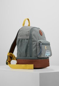 Sac à dos en tissu gris avec une poignée jaune, fond marron, poche avant ornée d'une fourgonnette bleue, d'une lune et d'étoiles brodées. Poche latérale en mesh incluse.