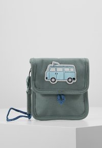 Sac à dos vert menthe et accessoires avec motifs de camionnette bleue, accents en cuir, fermetures éclair et un haut à cordon coulissant sur le sac.