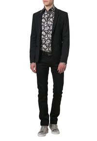 Homme portant un blazer noir, une chemise noire à fleurs blanches, un pantalon noir, une ceinture noire et des baskets grises, debout devant un fond blanc.