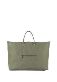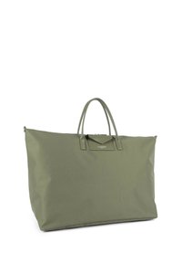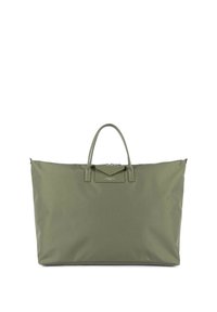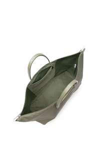 Grand sac cabas vert olive avec double poignée et petite poche avant à rabat, sur fond blanc uni.