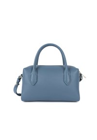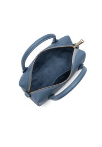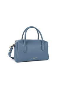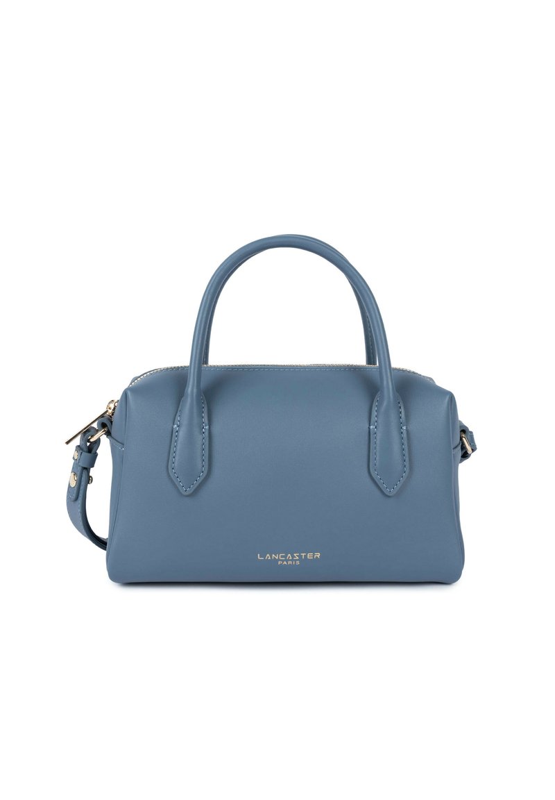 Sac à main en cuir bleu avec doubles poignées, fermeture éclair dorée et bandoulière amovible, arborant le logo « Lancaster Paris » à l'avant.