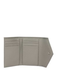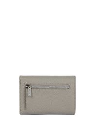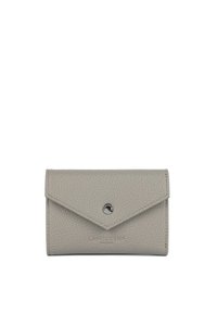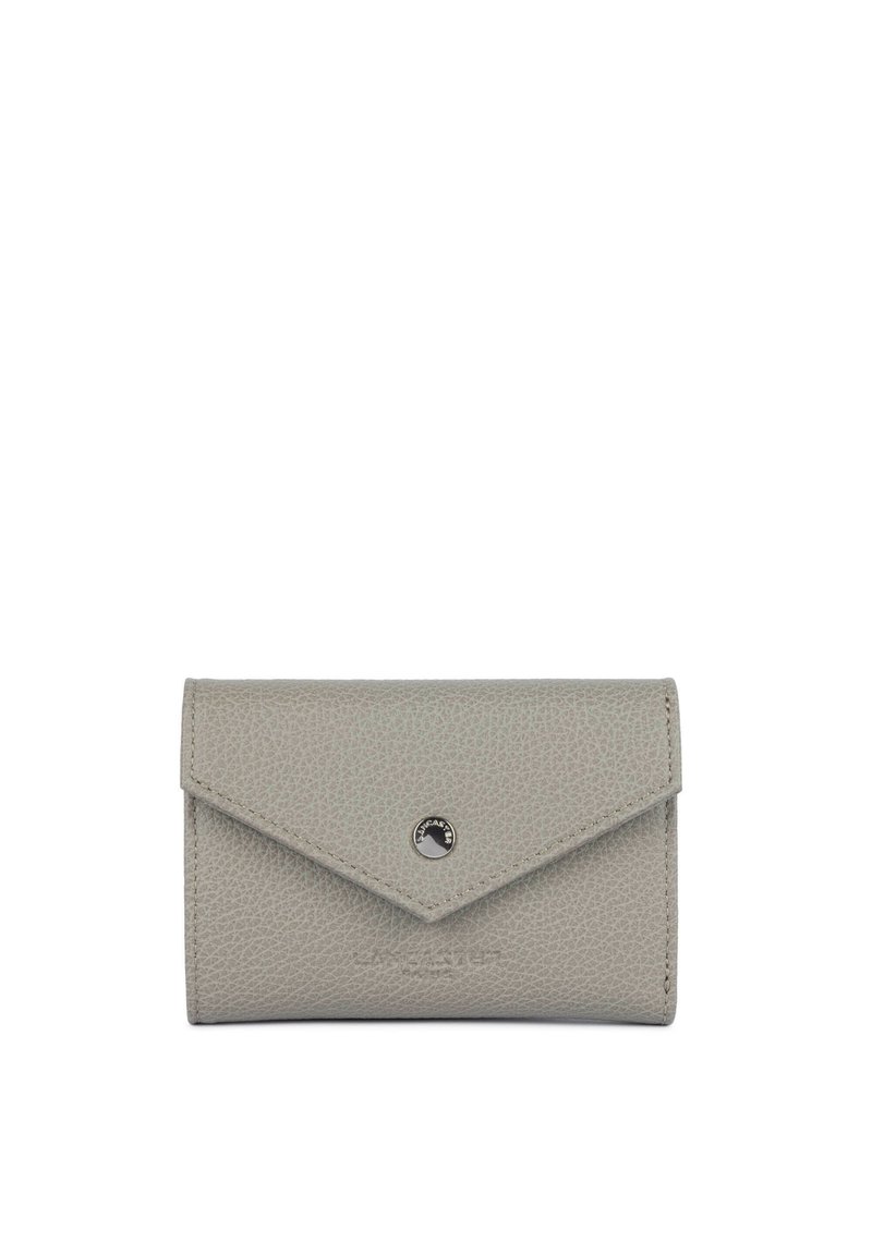 Portefeuille en cuir gris texturé avec un rabat avant de style enveloppe et une petite fermeture par bouton rond argenté centrée sur un fond blanc.