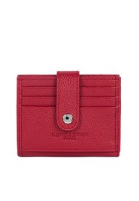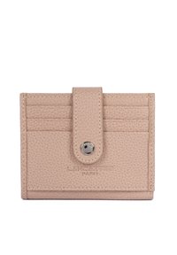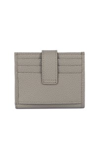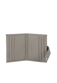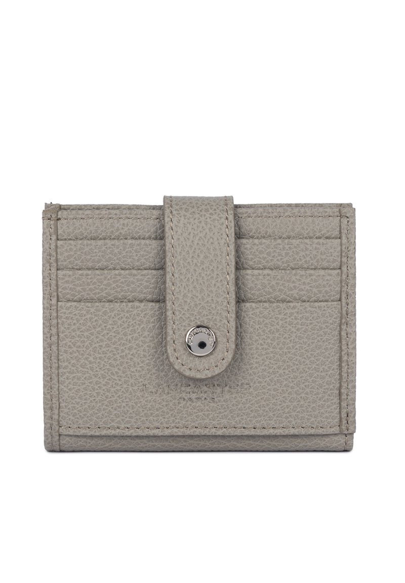 Portefeuille en cuir gris texturé avec six emplacements pour cartes et une fermeture centrale à bouton-pression.
