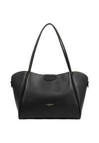 Sac fourre-tout en cuir marron avec de longues anses, une petite fermeture à rabat et le logo "Lancaster Paris" centré sur le devant.