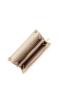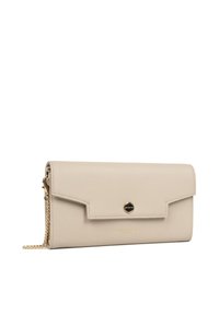 Pochette en cuir beige texturé avec rabat avant, bandoulière chaîne dorée et fermeture par bouton rond avec logo métallique.
