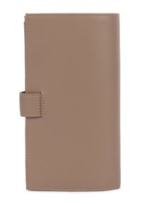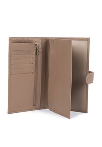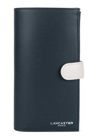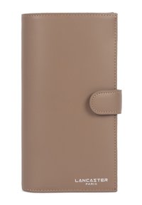 Portefeuille en cuir taupe avec fermeture par bouton-pression, forme rectangulaire, et logo "LANCASTER PARIS" en blanc dans le coin inférieur droit.