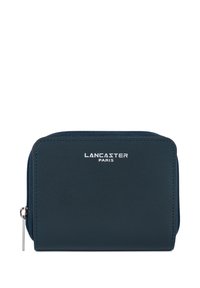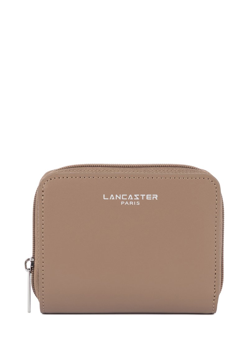 Portefeuille beige compact avec fermeture éclair argentée et logo "Lancaster Paris" centré à l'avant.