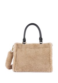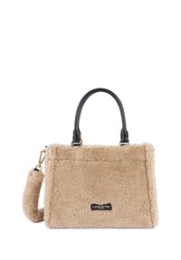 Sac à main rectangulaire beige en fourrure synthétique avec poignées noires, sangle en peluche amovible et plaque logo dorée "Lancaster Paris" sur le devant.