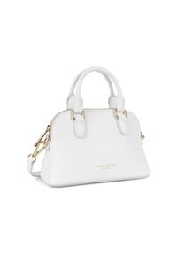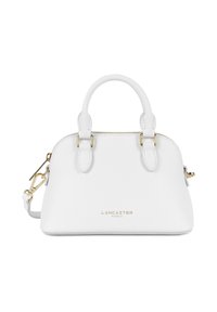 Sac à main Lancaster en cuir blanc avec deux poignées, fermoir à glissière doré, bandoulière amovible et logo "Lancaster Paris" en or sur le devant.