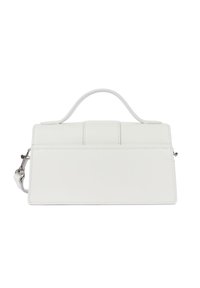 Sac à main rectangulaire blanc avec poignée supérieure, rabat avant, fermoir métallique et bandoulière réglable sur fond blanc.