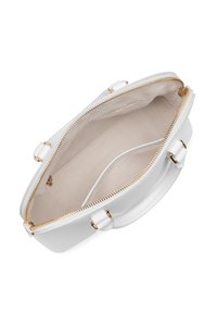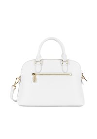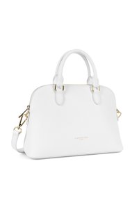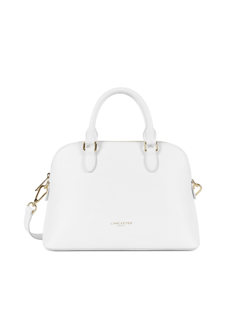 Sac à main Lancaster Paris en cuir blanc avec deux poignées, bandoulière amovible, ferrures dorées et fermeture éclair.