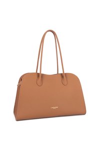 Sac à main en cuir fauve avec une forme structurée et arrondie, doté de longues poignées doubles, et arborant un petit logo doré "Lancaster Paris" centré près du bas.