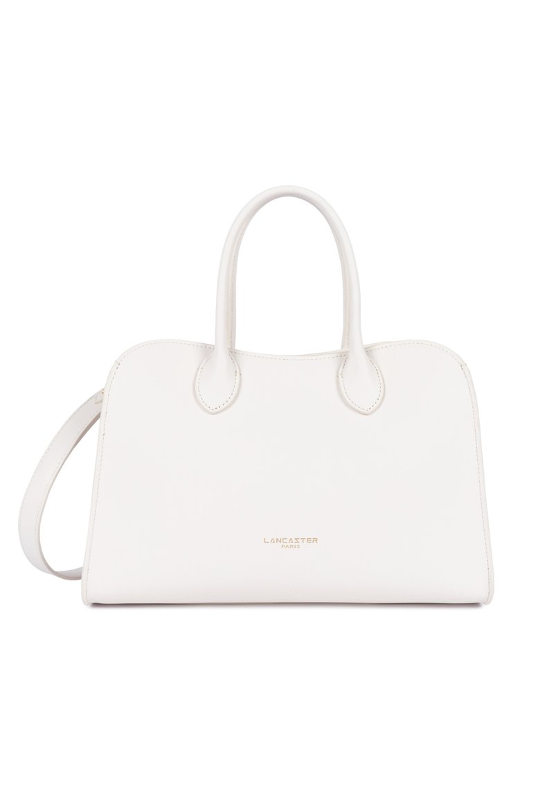 Sac à main en cuir blanc avec deux poignées et une bandoulière amovible, logo "Lancaster Paris" en doré subtil sur le devant.