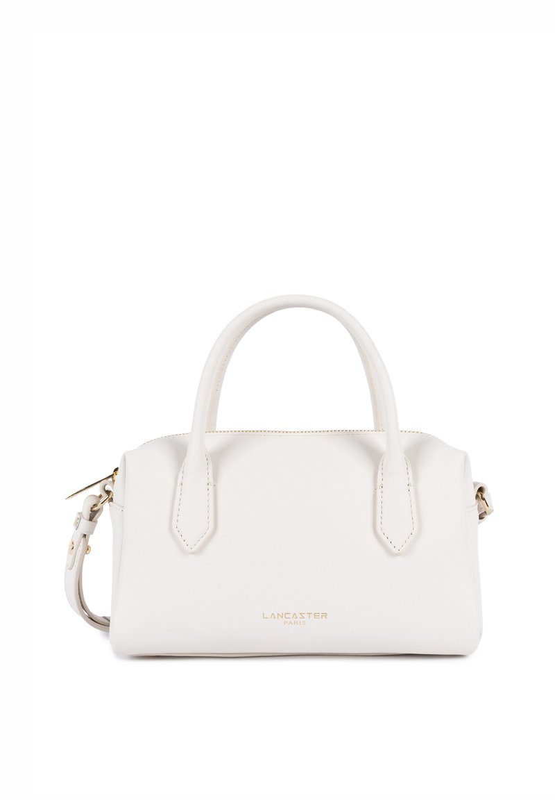 Sac à main en cuir Lancaster Paris blanc avec deux poignées supérieures, bandoulière amovible et fermeture éclair dorée.