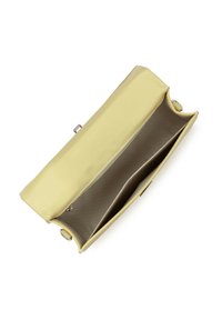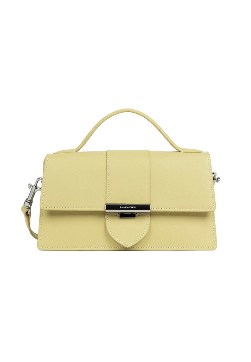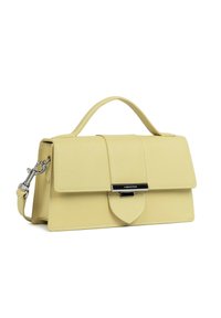 Sac à main rectangulaire en cuir jaune pâle avec poignée supérieure, rabat avant, fermoir argenté et bandoulière amovible sur fond blanc.