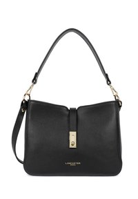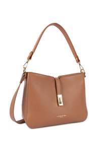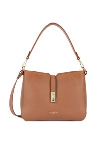 Sac à main en cuir marron moyen avec texture granuleuse, fermeture à clip doré, bandoulière réglable, et logo "Lancaster Paris" embossé sur le devant.