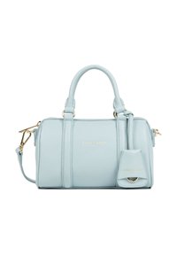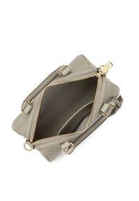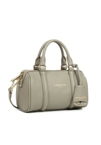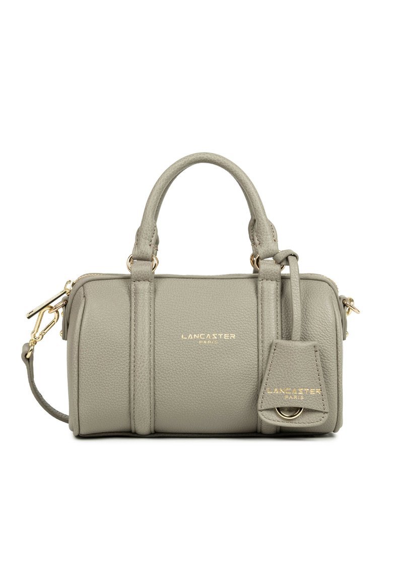 Sac à main Lancaster Paris en cuir texturé gris avec deux poignées, garniture dorée et étiquette en cuir de marque attachée.