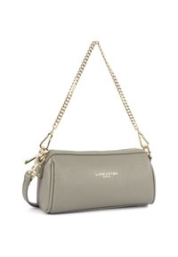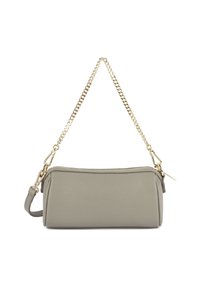 Sac à main rectangulaire en cuir gris avec bandoulière chaîne dorée et fermeture éclair, doté d'un petit logo doré embossé au centre avant.