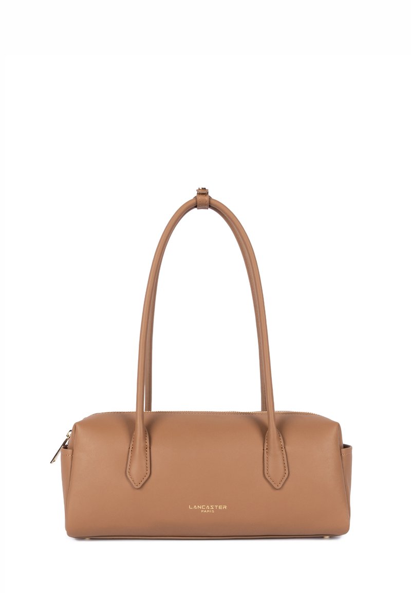 Sac à main rectangulaire en cuir marron clair avec de longues anses courbées, fermeture éclair sur le dessus et logo "Lancaster Paris" en lettres dorées au centre à l'avant.