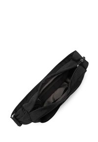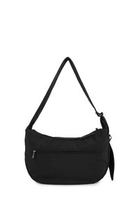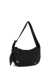 Sac d'épaule noir avec bandoulière réglable, poches avant, cordon décoratif et petit emblème en forme de cœur argenté en bas à droite.