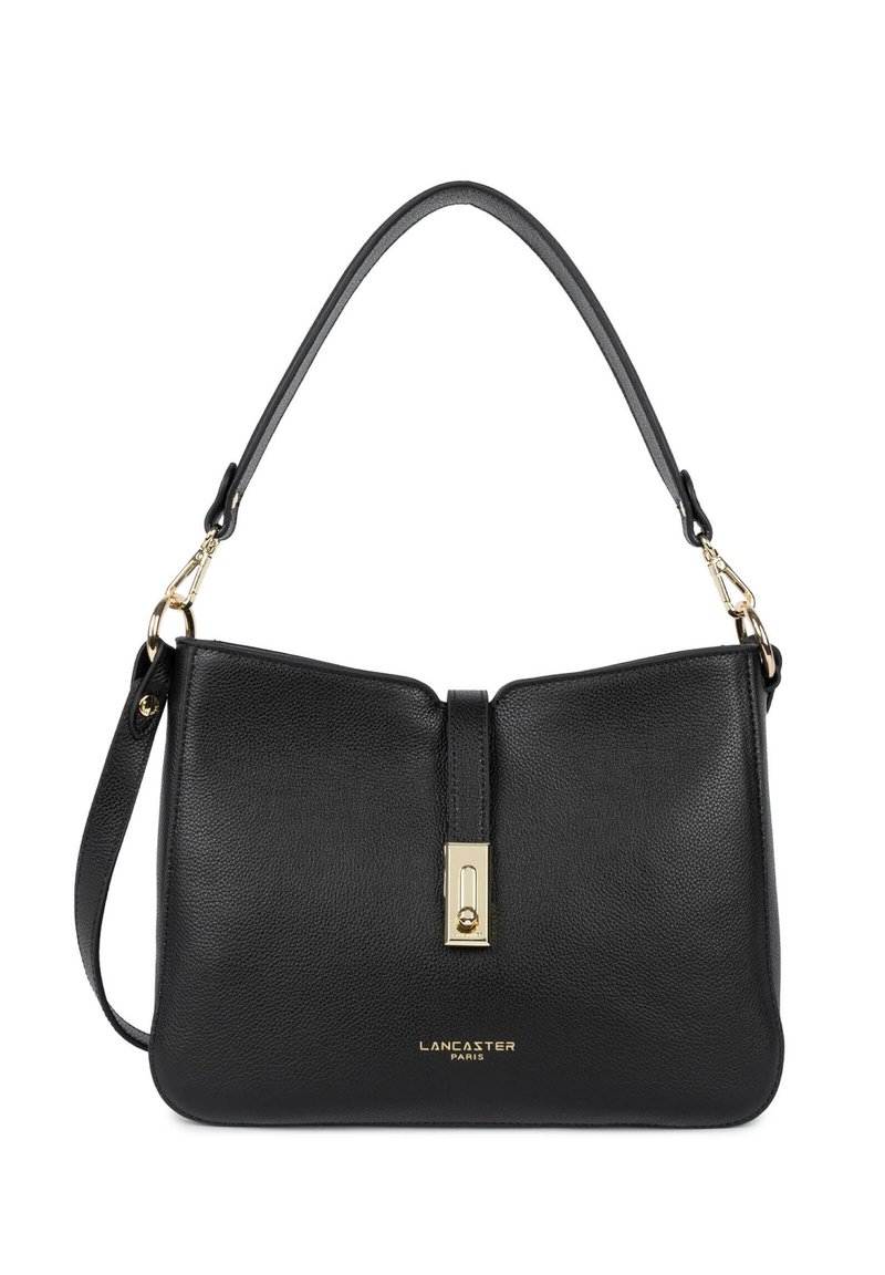 Sac à main Lancaster Paris en cuir noir avec fermoir doré, poignée supérieure incurvée et bandoulière amovible.