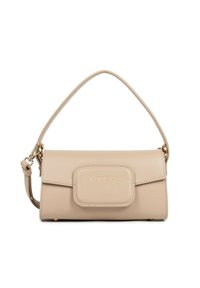 Sac bandoulière en cuir noir à finition texturée, avec des accents de ferrures dorées et une sangle amovible. Comprend un rabat avec logo.