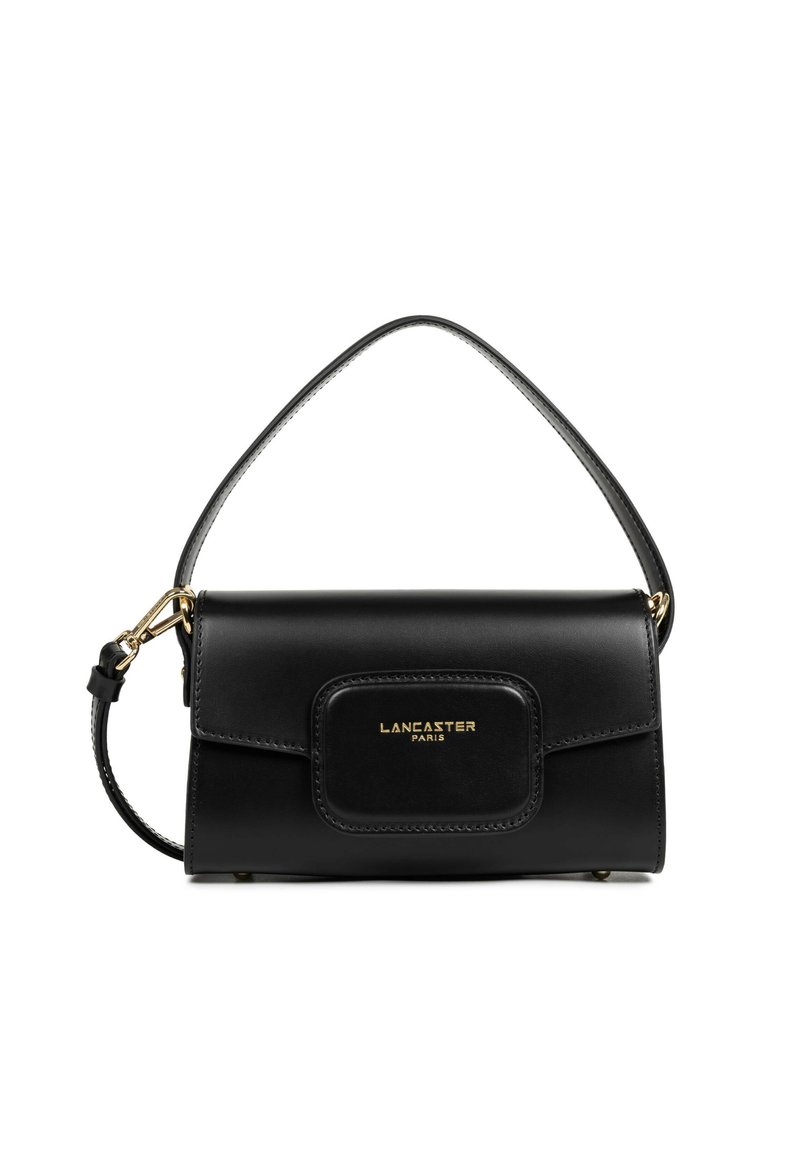 Sac à main rectangulaire en cuir noir avec une seule poignée supérieure, des accessoires dorés, et le logo "LANCASTER PARIS" sur la poche avant.