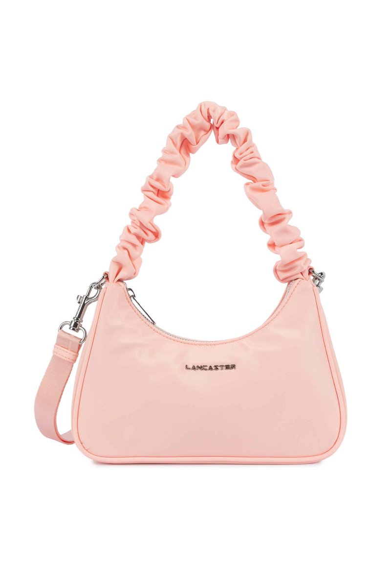 Sac à main Lancaster rose clair avec poignée froncée, bandoulière amovible, fermeture éclair argentée et logo de marque en métal à l'avant.